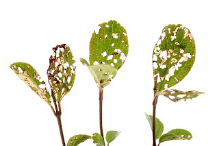 害虫 葉に穴が空く。天芽の葉の奇形、花の奇形。葉がかすり模様のようになる。根元から噛み千切られる。